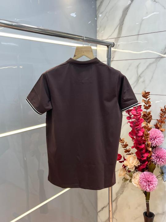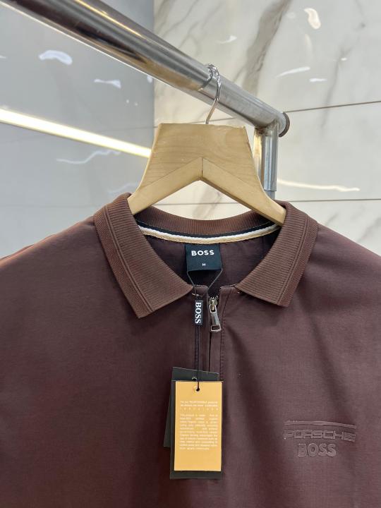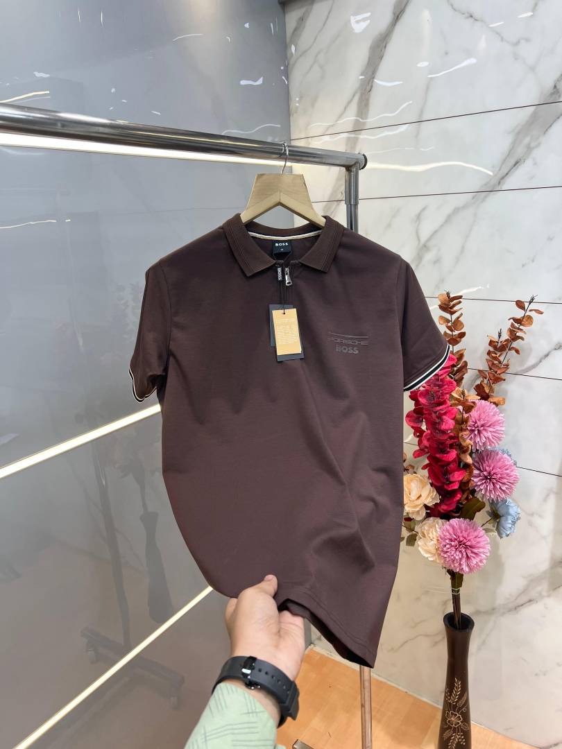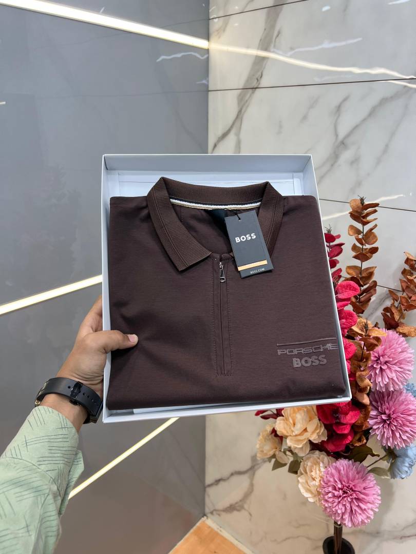 Hugo Bos s Brown Premium Imported 240 GSM Interlock Lycra Fabric Polo Tshirt with Emboss Logo and Brand Box Zip Style 3987